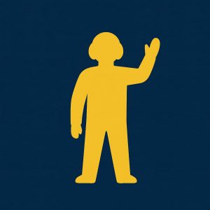 a man on the flight deck stands in brown with his hands up at his sides, holding up two fingers on each hand.